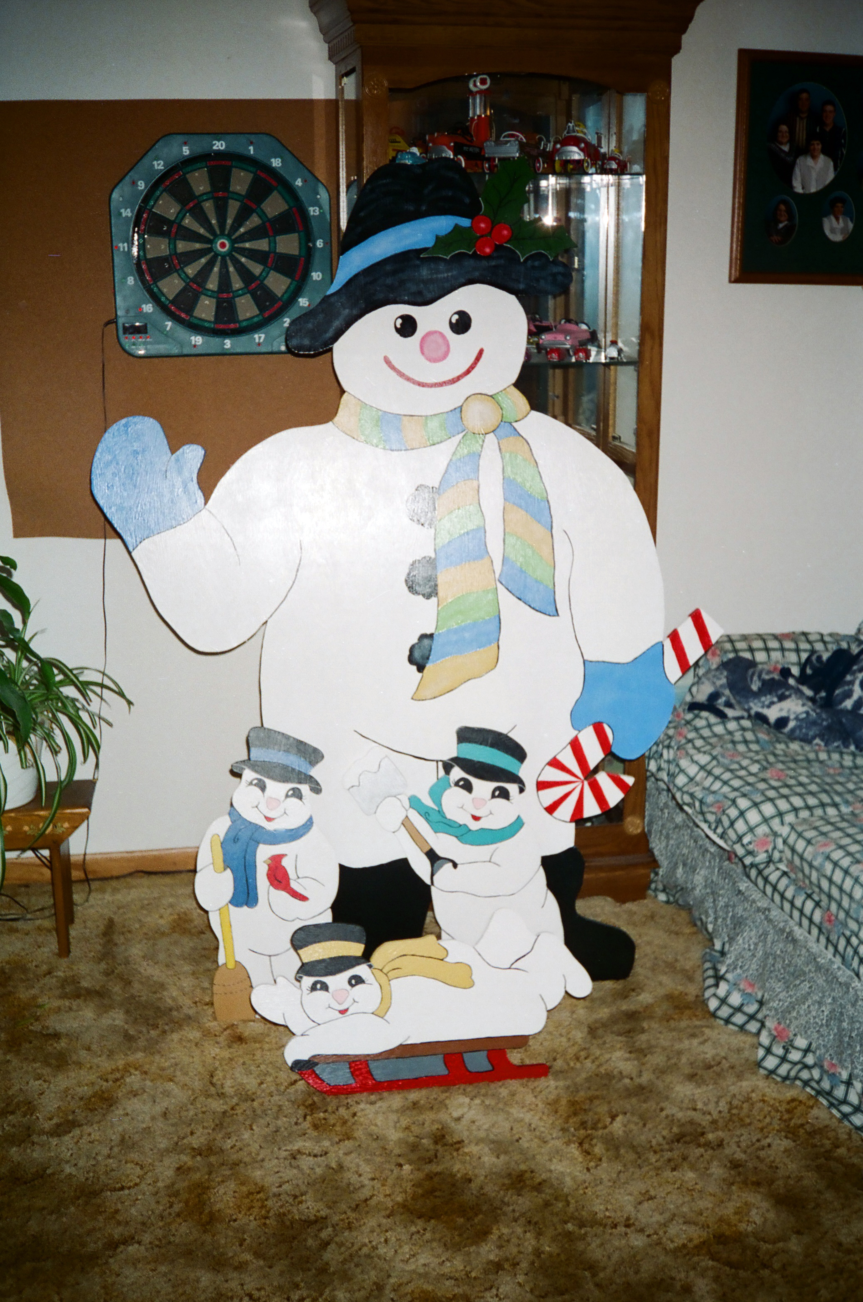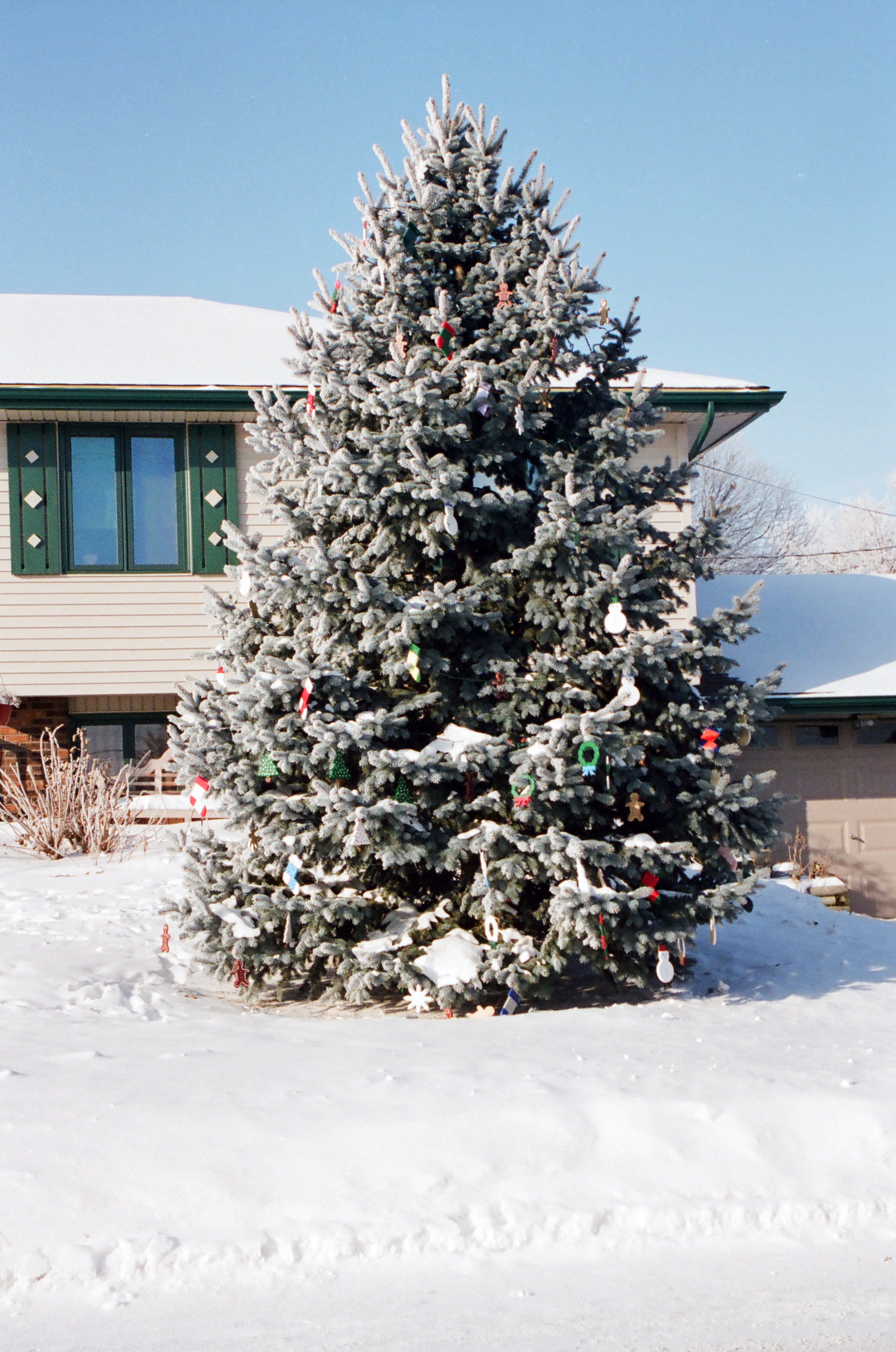 1. My mom’s decorations-the first several photos below show the many decorations Mom had in and out of the house. I don’t have an easily accessible photo of Santa’s Village that she painted but it used to be across the entire front yard every year. I did find the snowmen but I feel they were a later addition, after I was out of school. We also always had real candy canes on the tree and LOTS of ornaments. I can’t explain the underwear on the tree but several of the other ornaments are ones made by my mom or other family members. The photos of duck duck goose include Jamie’s mom Jolene but also show Mom’s collection of Santas in the front window. And then outside she made huge wooden ornaments for the Blue Spruce.
