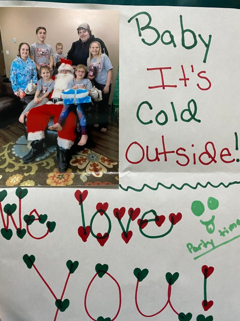 I almost feel like this memory can stand on it’s own with no explanation. Everyone seems to know ‘the story’ though it seems to grow every time it is told. When Facebook memories come through from when the oldest kids were little, I laugh when they are about the kids teasing her about running into Caseys over 10 years ago. I think one of my funniest memories of the whole Caseys saga is from when we were at the Open Door Mission serving a Christmas meal. We were headed back to Treynor and Missy had stopped to pick up dinner for everyone. She texted the kids a photo as if she was eating their fries. So we downloaded a photo of a car that had crashed into the front of a random Casey’s store and sent it to her. She texted back asking us if we were stopping for gas. She didn’t see the car through the door of the store. It was fun to plan these shirts for her last year.