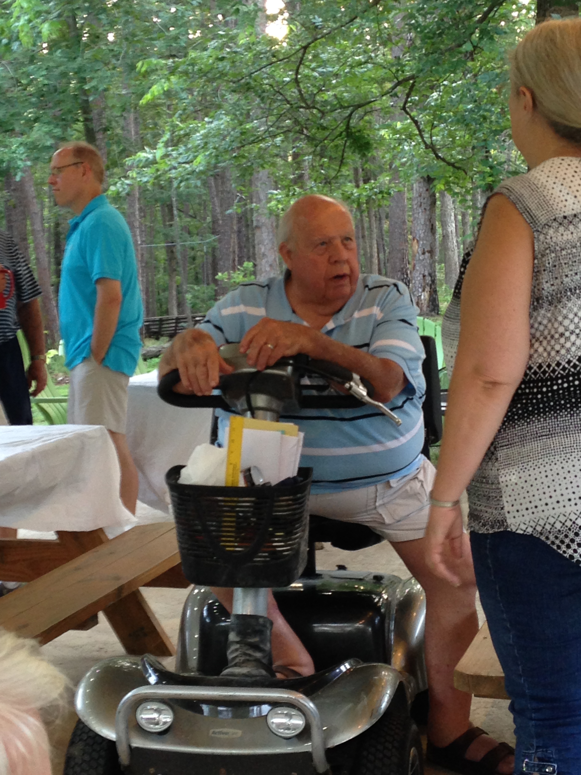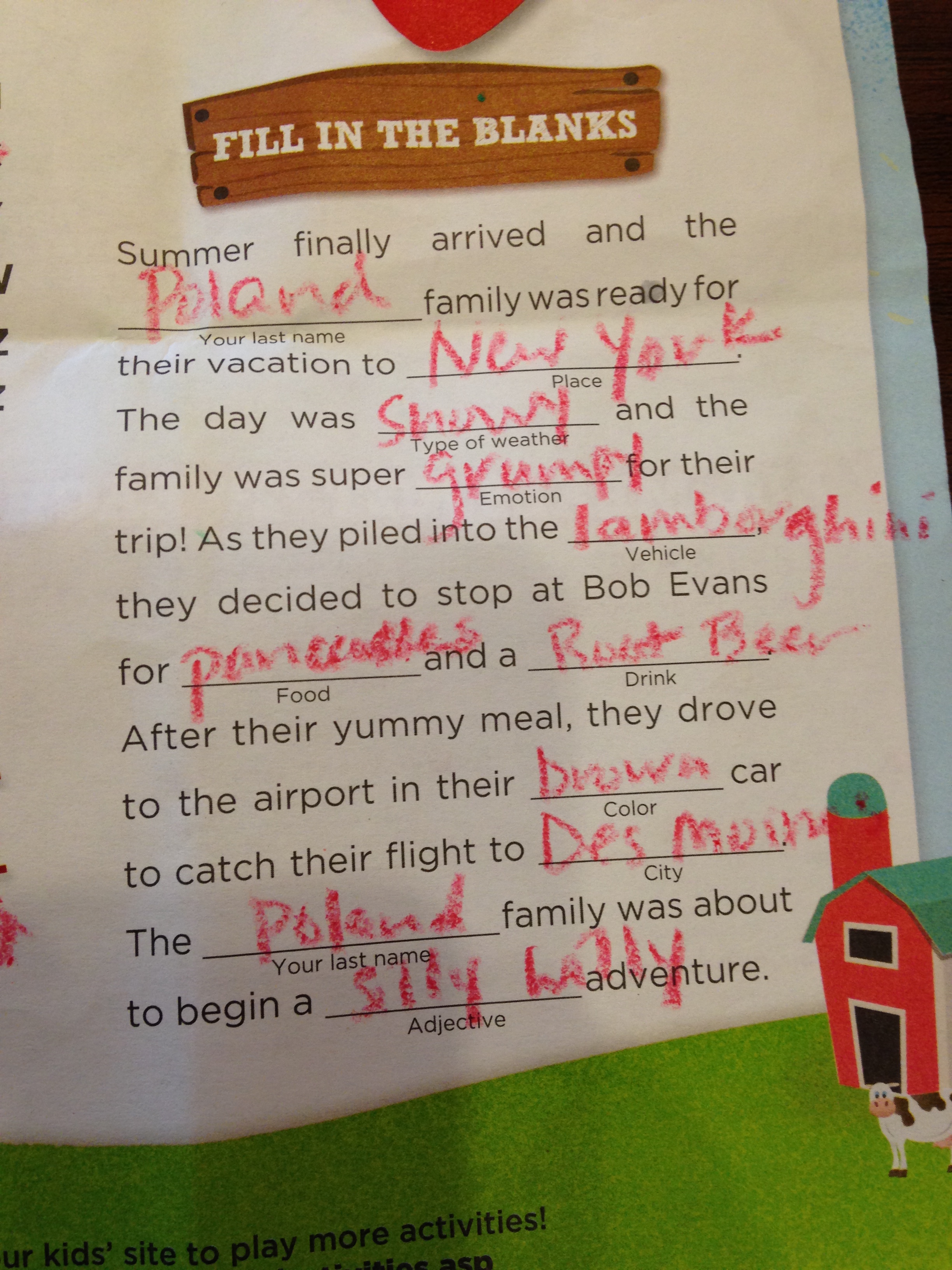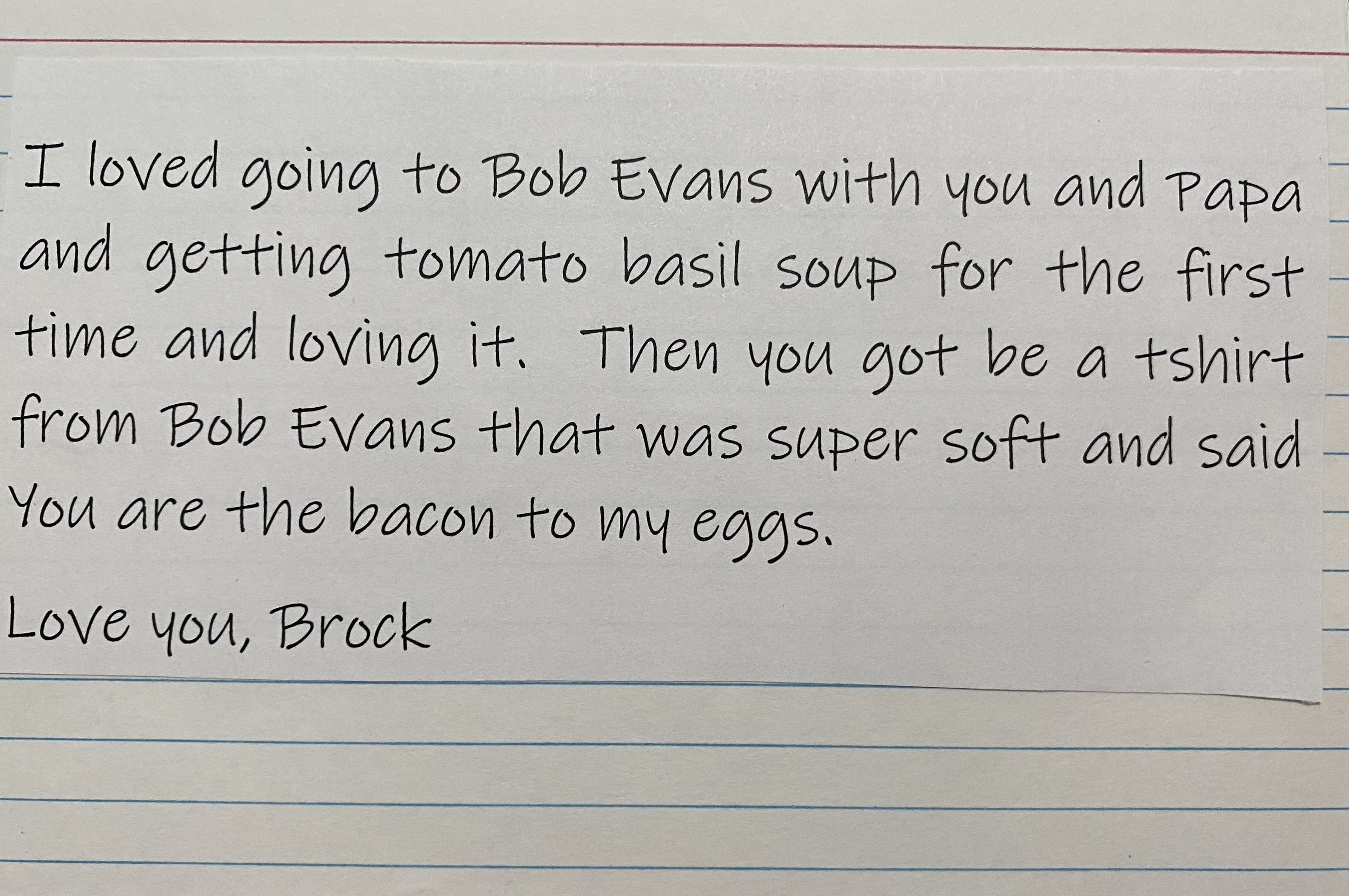 When I made my list of memories with the kids, today’s memory from Brock was not on my list but it should have been. It was actually a trip to see Papa at the lake and then on to Uncle Jim’s 75th birthday party. We stopped at Bob Evans on the way down to the birthday celebration and on the way back to the lake. Not only did we love the tomato basil soup, we had fun with the kids menu activities as well. And Dad forgot Tate’s leash so we ended up using the strap from my duffel bag so Brock could walk him until we stopped and bought a new leash.