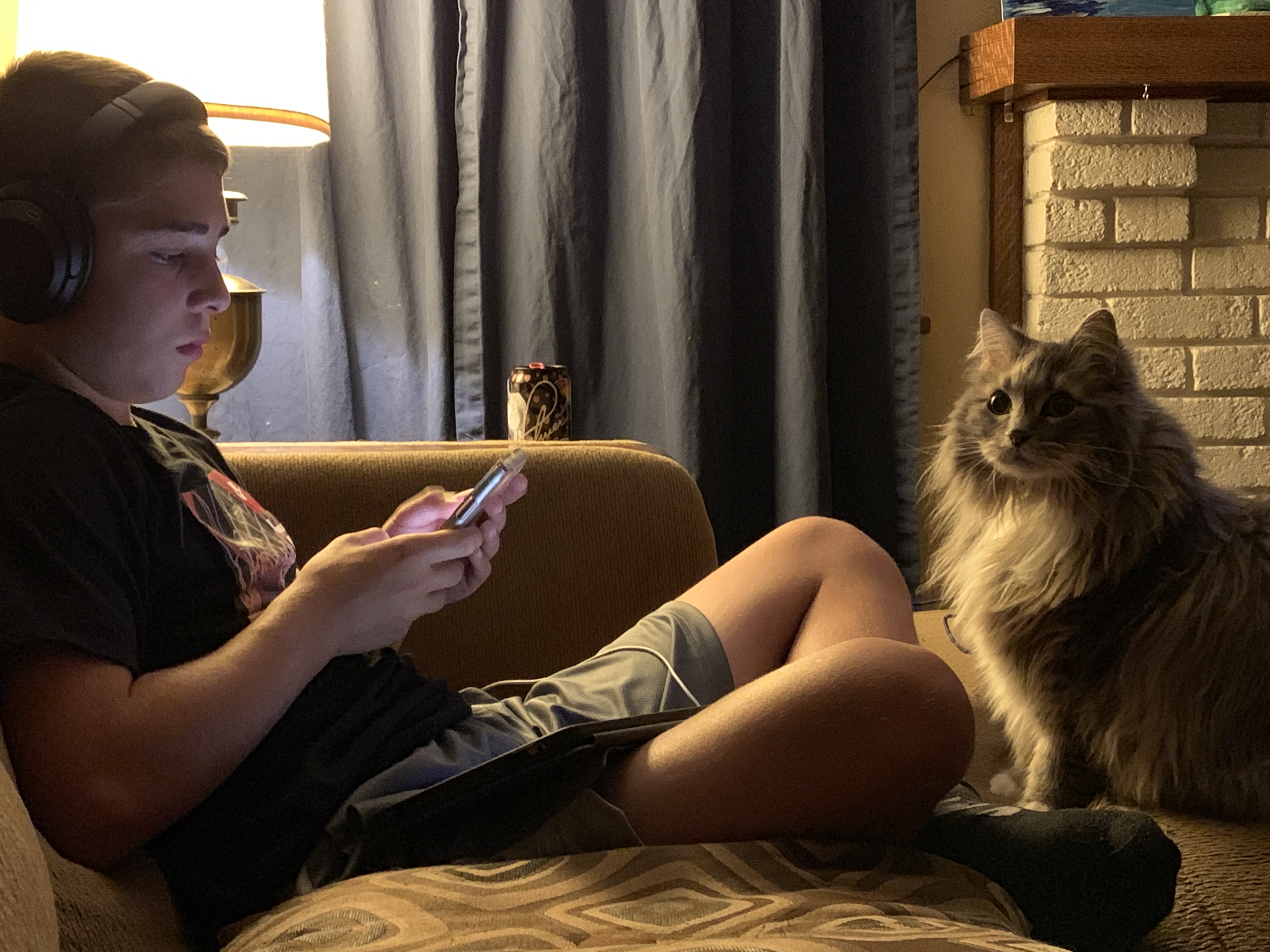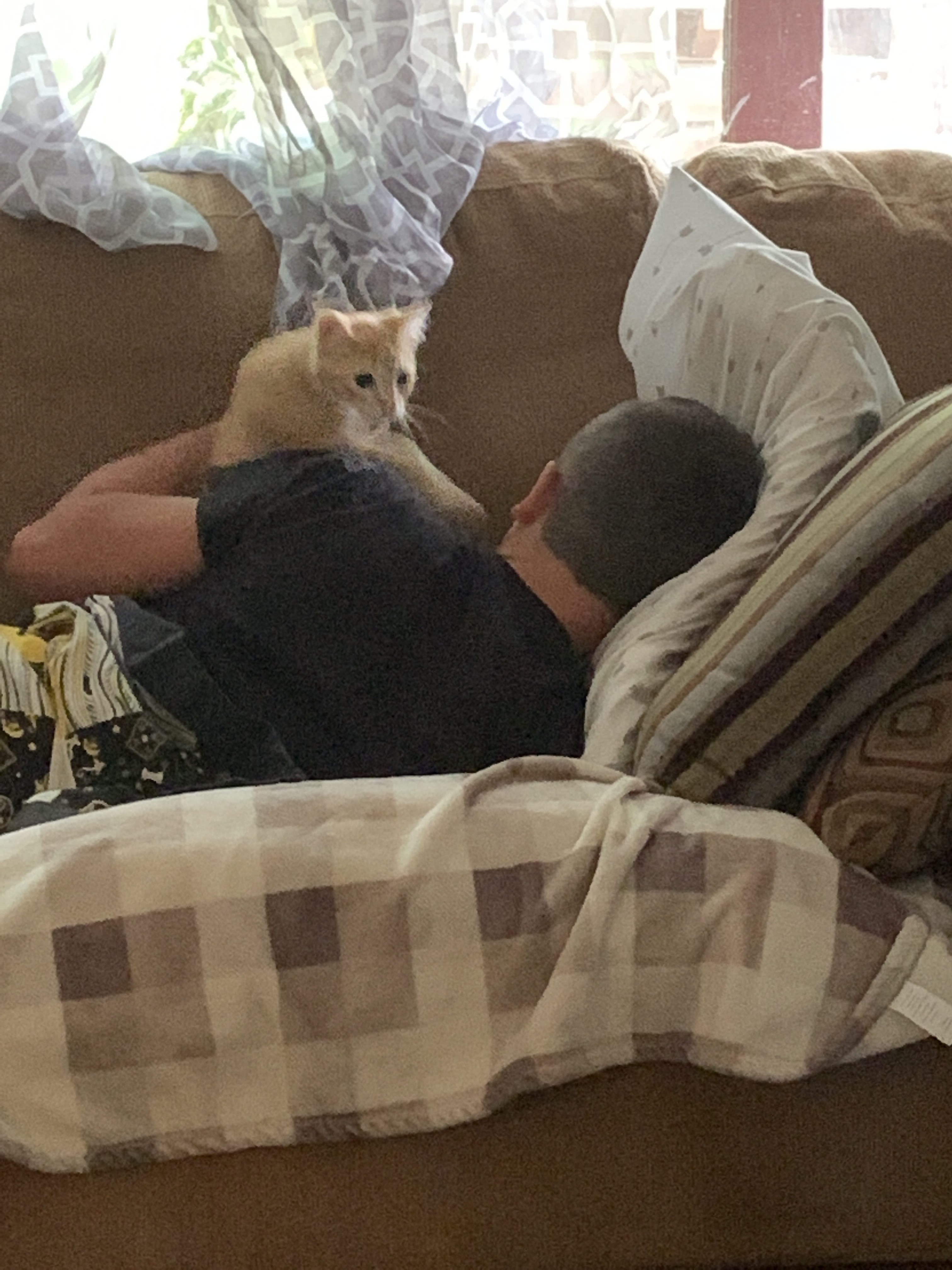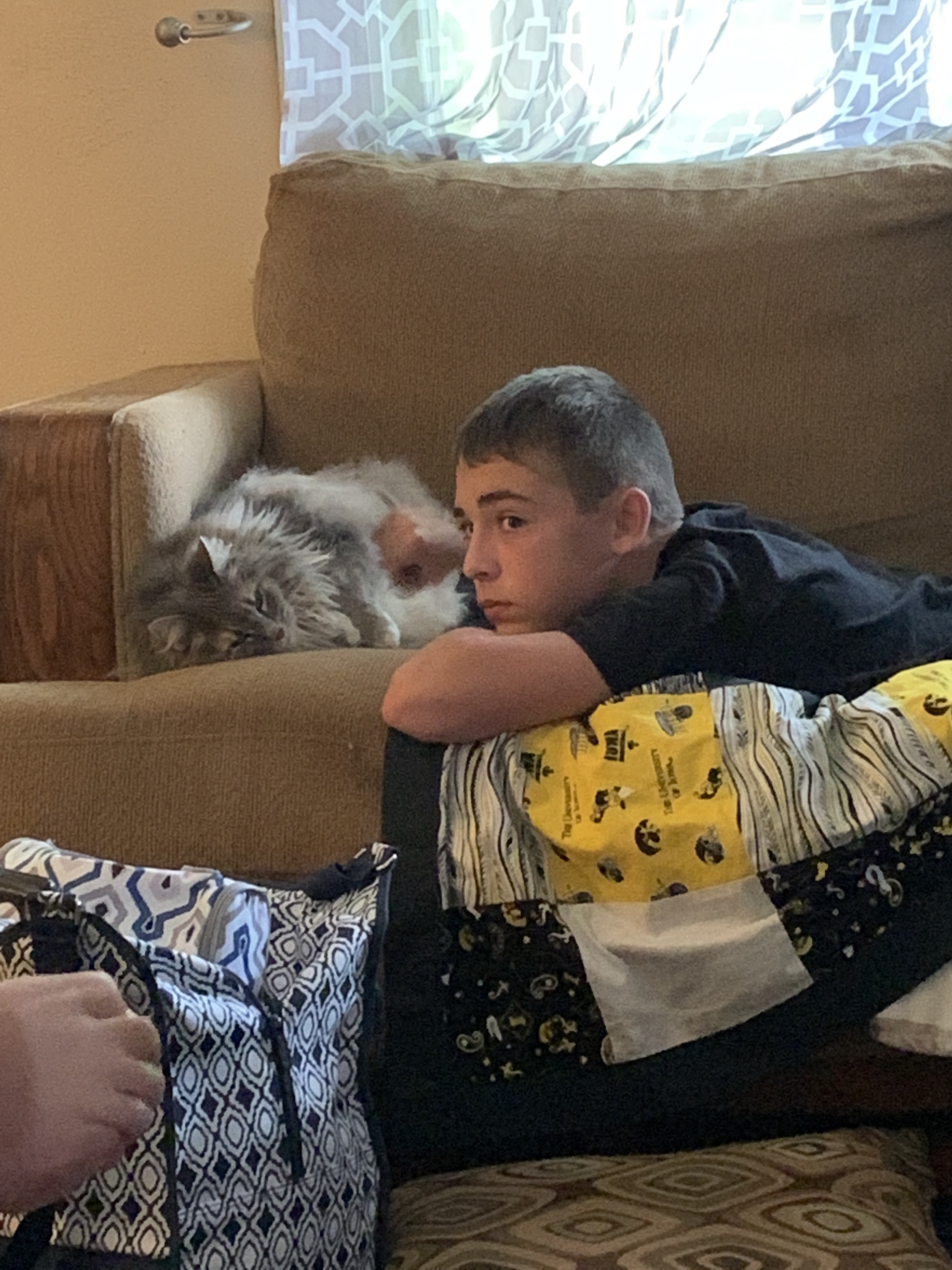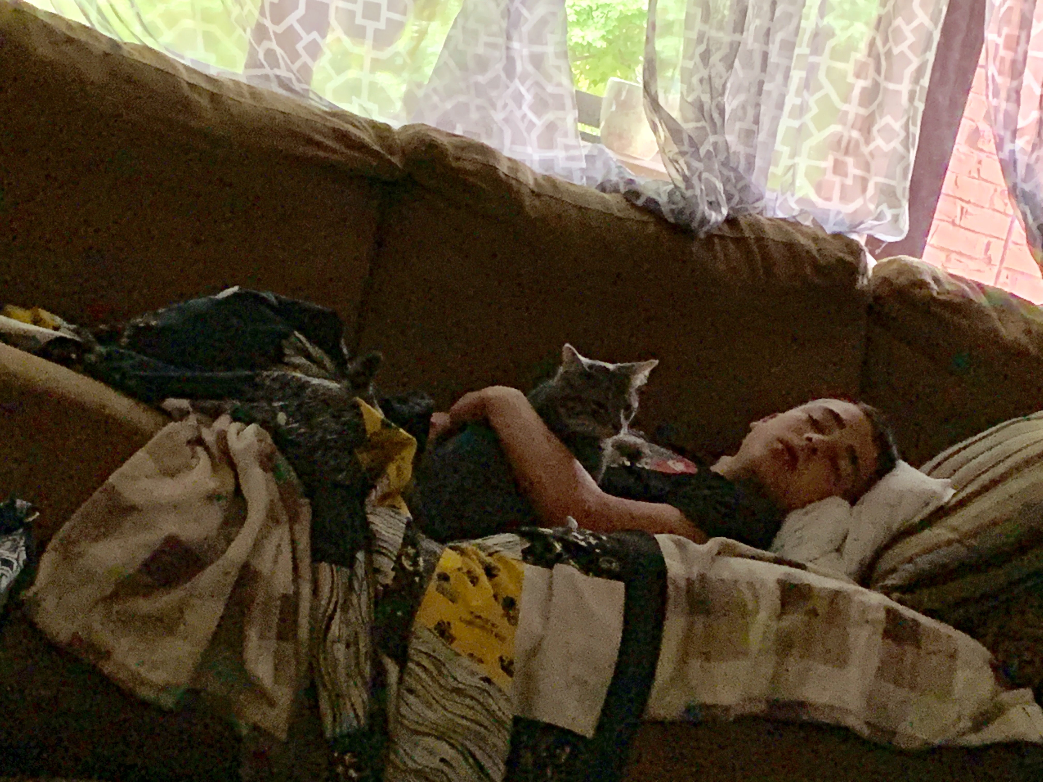 Brock has been my Storm Lake traveler several times now. This memory is from our most recent trip to Storm Lake the last time I was home for the summer. It was much easier driving with him when he had something to watch on the way there and back. Storm Lake is a favorite destination for a number of reasons-I get to see my friends and my old house, we get to go to the water park, and of course, donut holes! Storm Lake Bakery definitely does have the best donut holes. The funny thing about Brock and the donut holes is that he was only 2 when I left Storm Lake for Texas but still remembered the donut holes and always asked about them. He didn’t understand when I moved that I couldn’t still bring him donut holes. So I had friends who were coming to (or even near) Treynor bring them down. One of the first times they were delivered to my mom’s house, he saw the box on the kitchen island and tried to get them for himself and ended up spilling them all over the floor. On this trip, Brock was introduced to Kevin, my friend’s cat, and they bonded. I think if she had said it was okay, he would have taken Kevin home with him. He had fun with the other cats too, but Kevin was definitely his favorite.