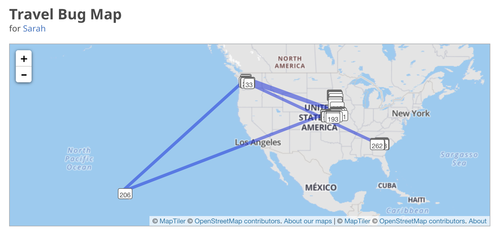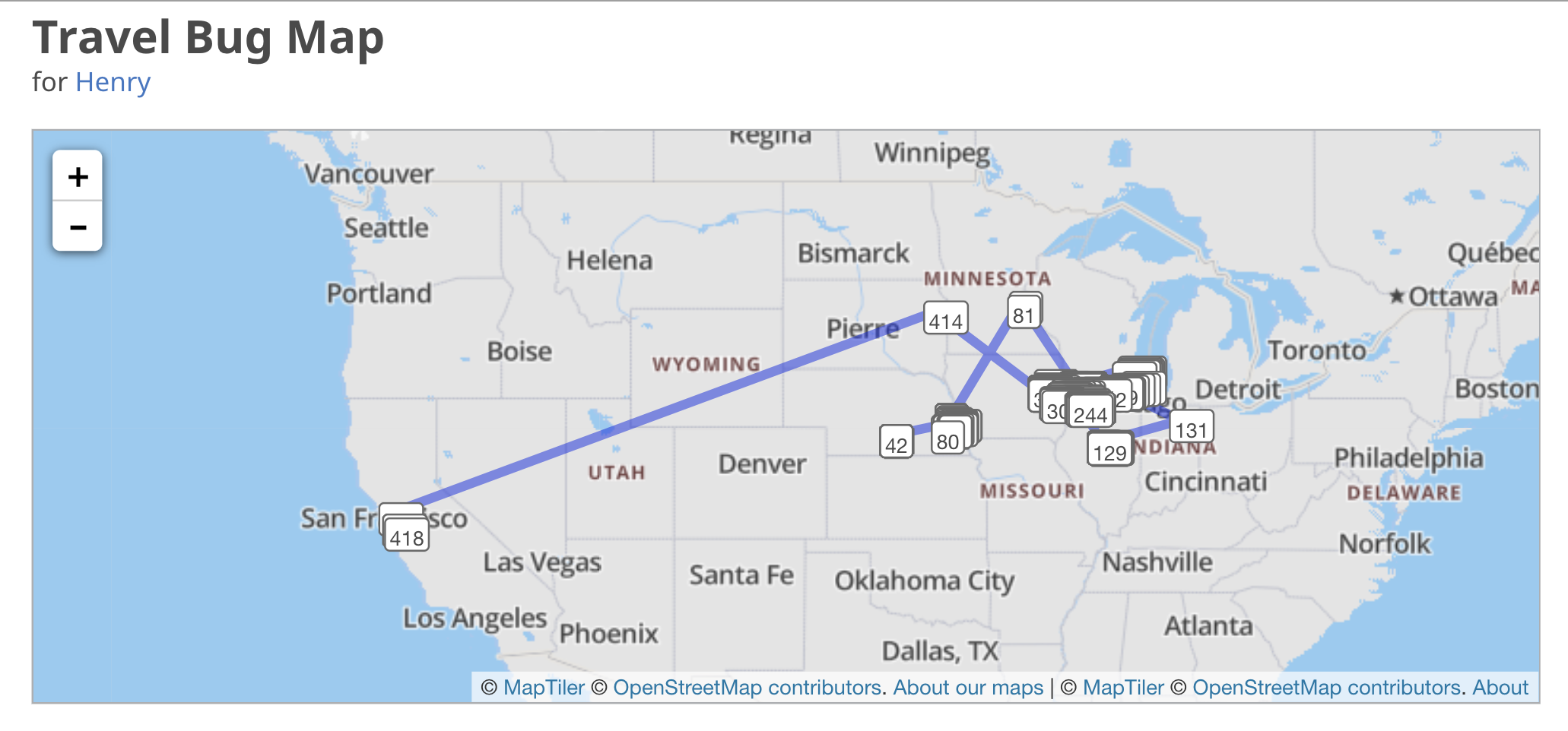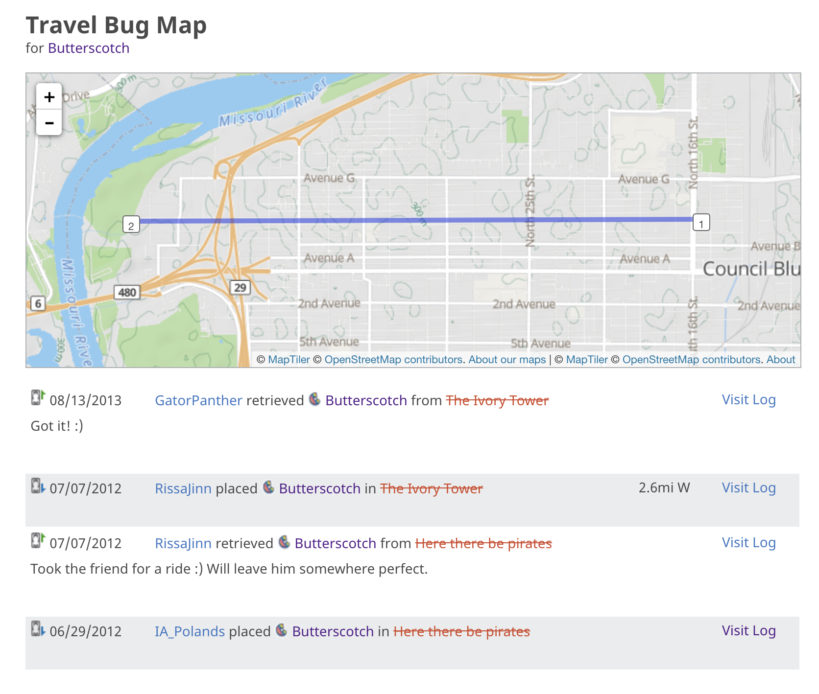 We released five trackables that summer as well. Here is a list of each trackable’s information and map of where it went.