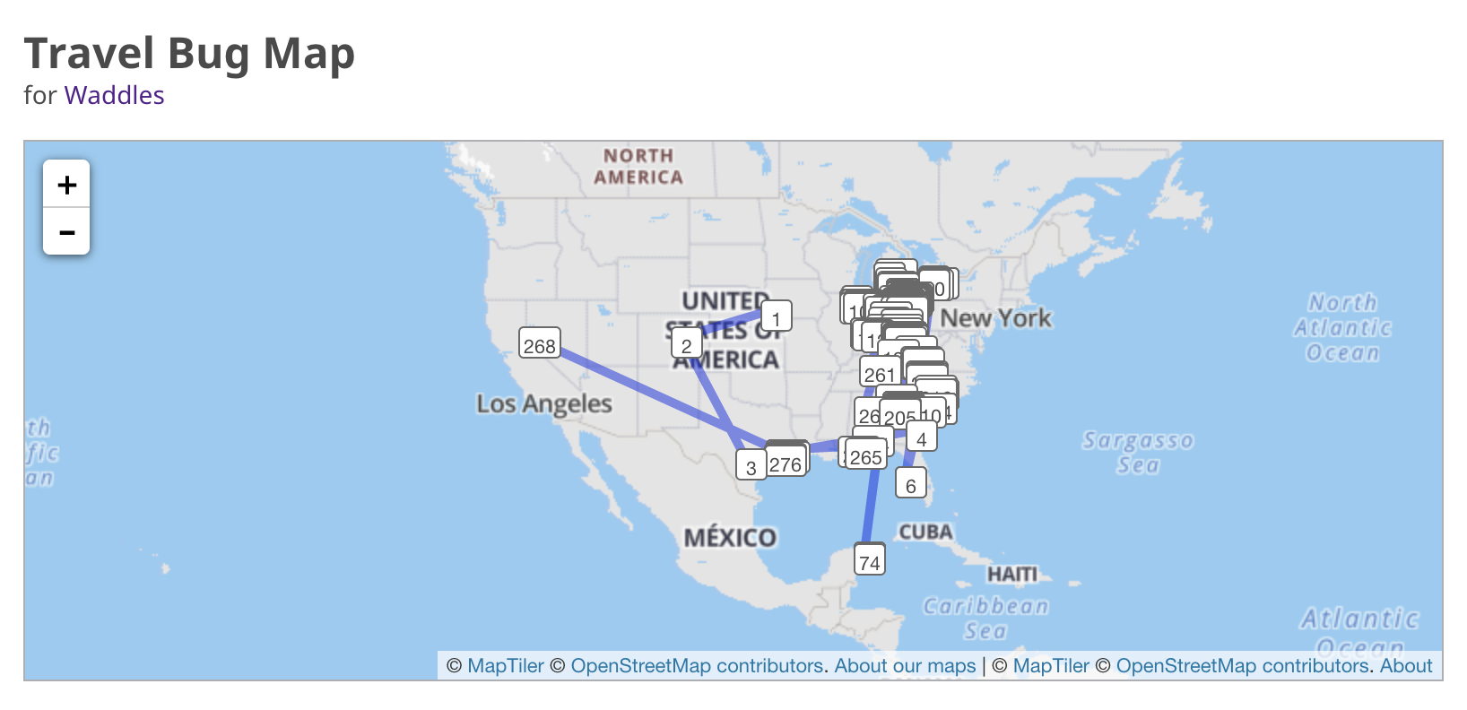 Waddles is the name of the beanie baby/beanie buddy penguin Granny had for all of us when we were young so we named this penguin after that first one because we miss Granny every day. We would like Waddles to visit every state in the United States and every province in Canada just like our Granny (though she never made it to Hawaii). Then we would like Waddles to visit countries that she would have liked to visit in Europe and around the world. We would love to see photos of Waddles visiting different places around the country and the globe. Waddles has travelled 19366 miles and has been all over the US as well as to Canada and Cancun.
